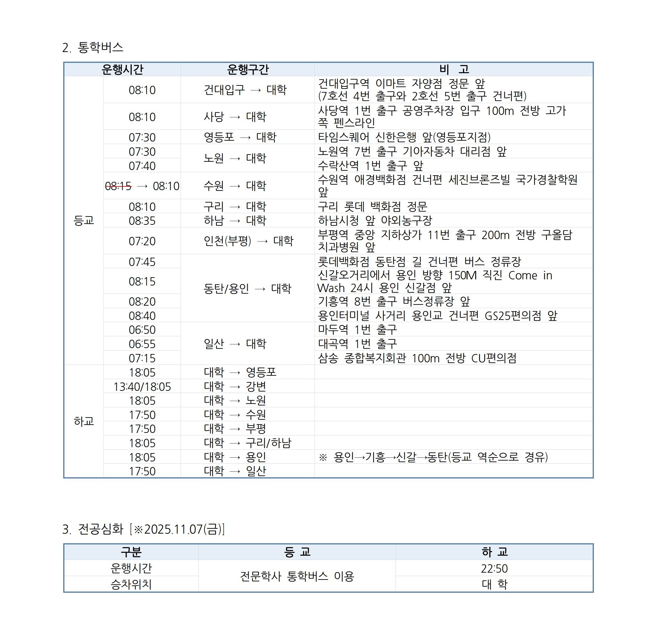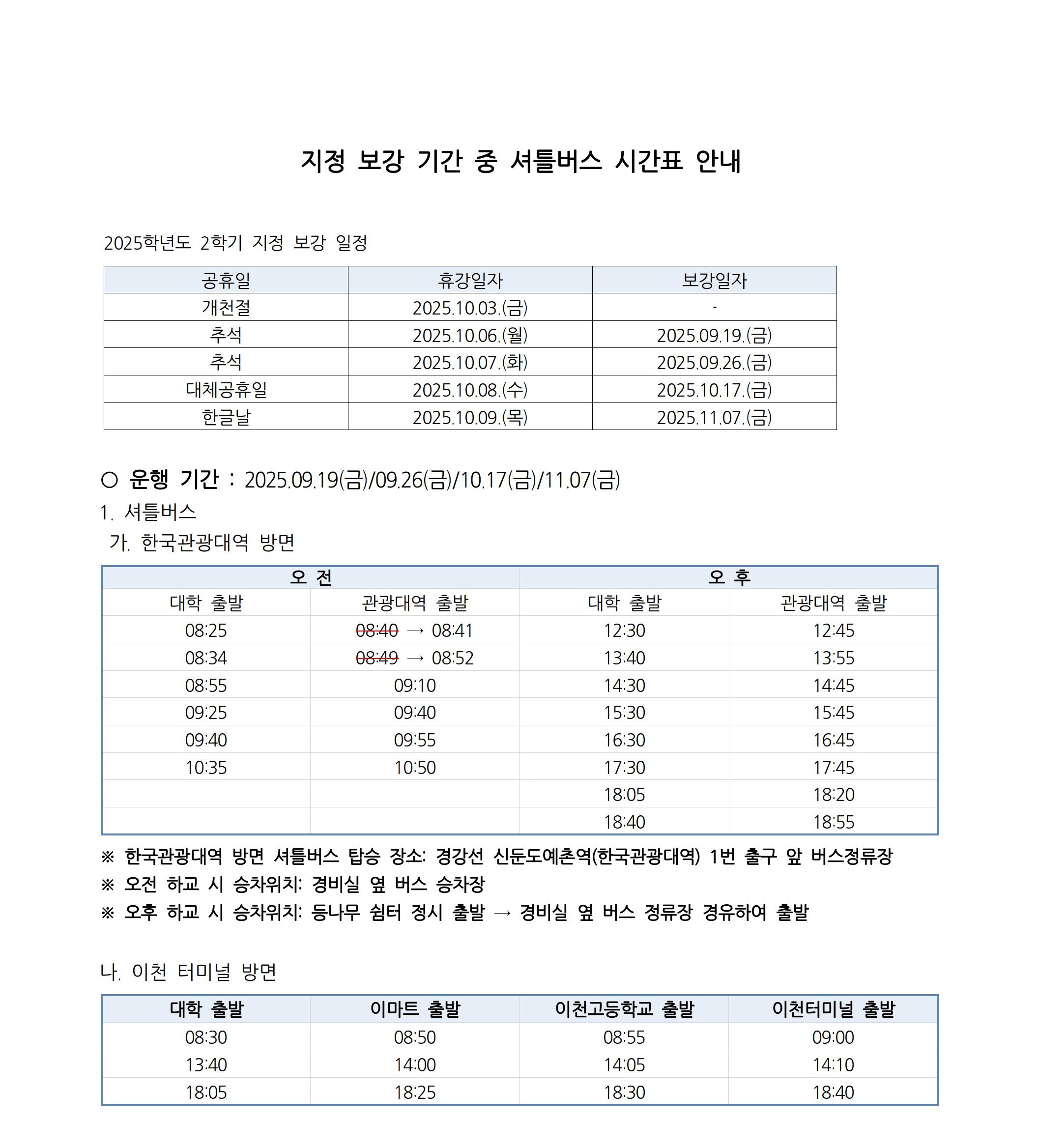 2025학년도 2학기 지정 보강 기간 중 셔틀버스 시간표 안내(2025.09.12.기준)