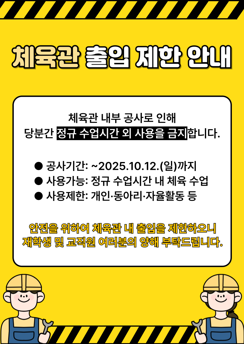 이에 따라 공사 완료 시까지 체육관은 정규 수업시간 외 사용이 제한됨을 알려드립니다.