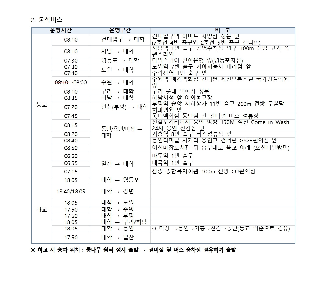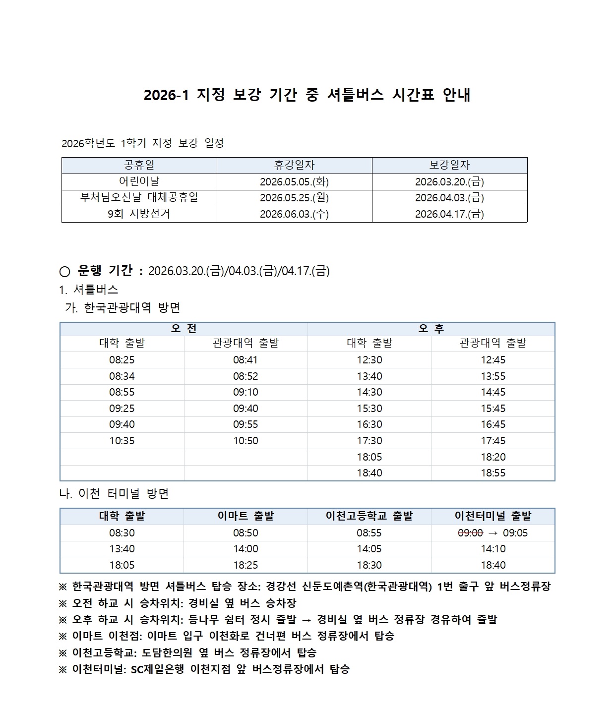 2026학년도 1학기 지정 보강 기간 중 셔틀버스 시간표 안내(2026.03.04기준)