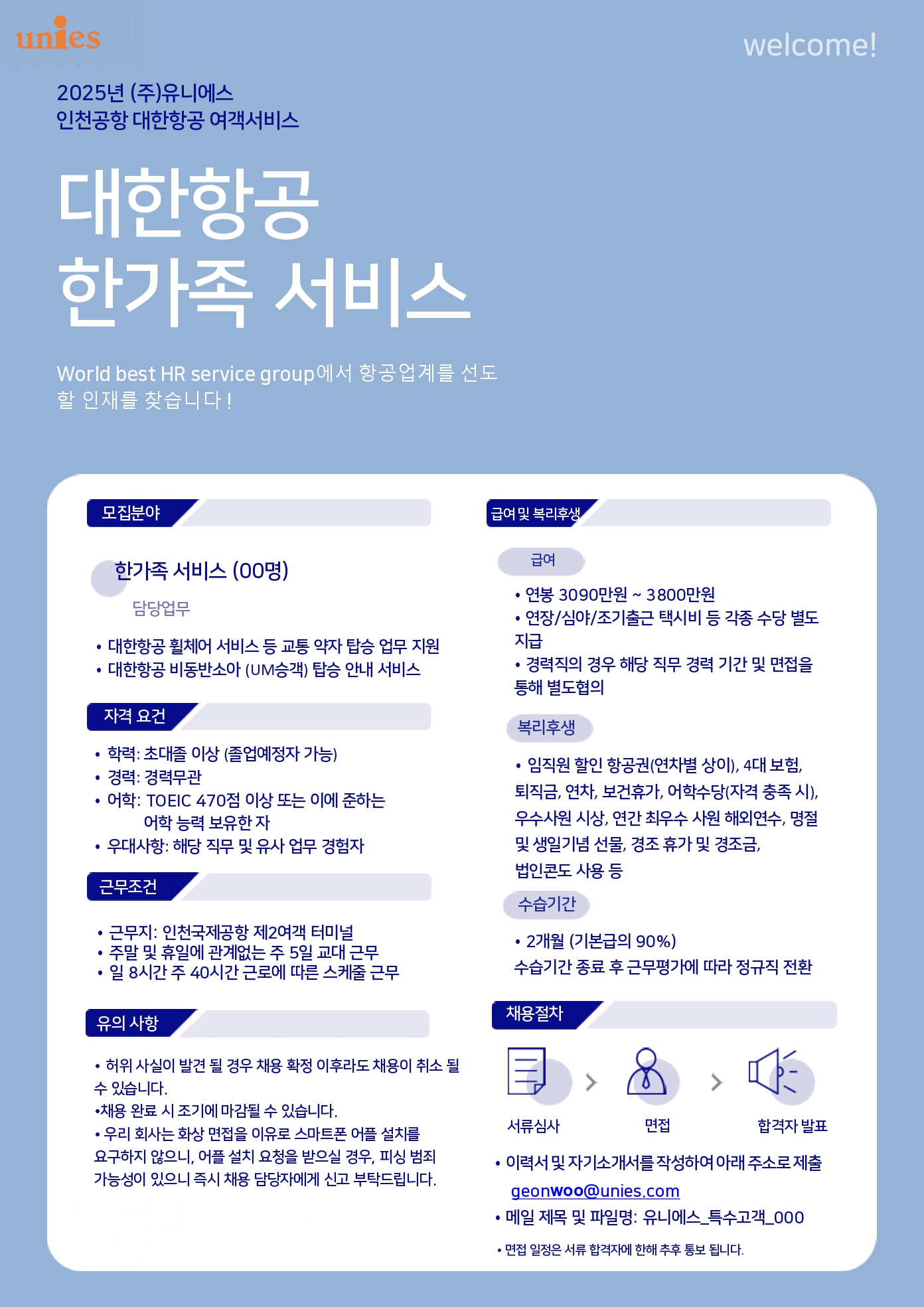 [추천채용] 유니에스 대한항공 한가족 서비스 담당자 채용