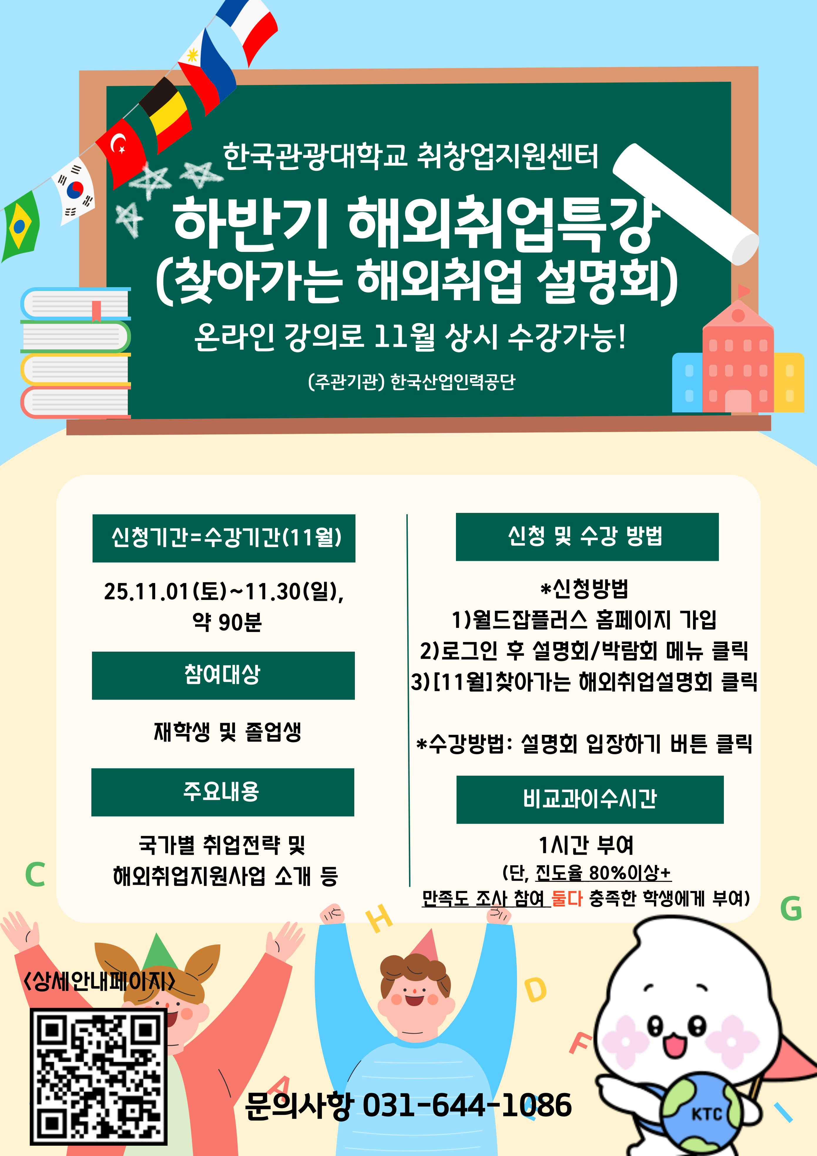 -한국관광대 학생들은 11월에 수강가능합니다. 꼭! [11월] 2025년 하반기 찾아가는 해외취업설명회(전국-온라인)를 신청해서 수강해주세요. (11월부터 신청, 수강 가능)
