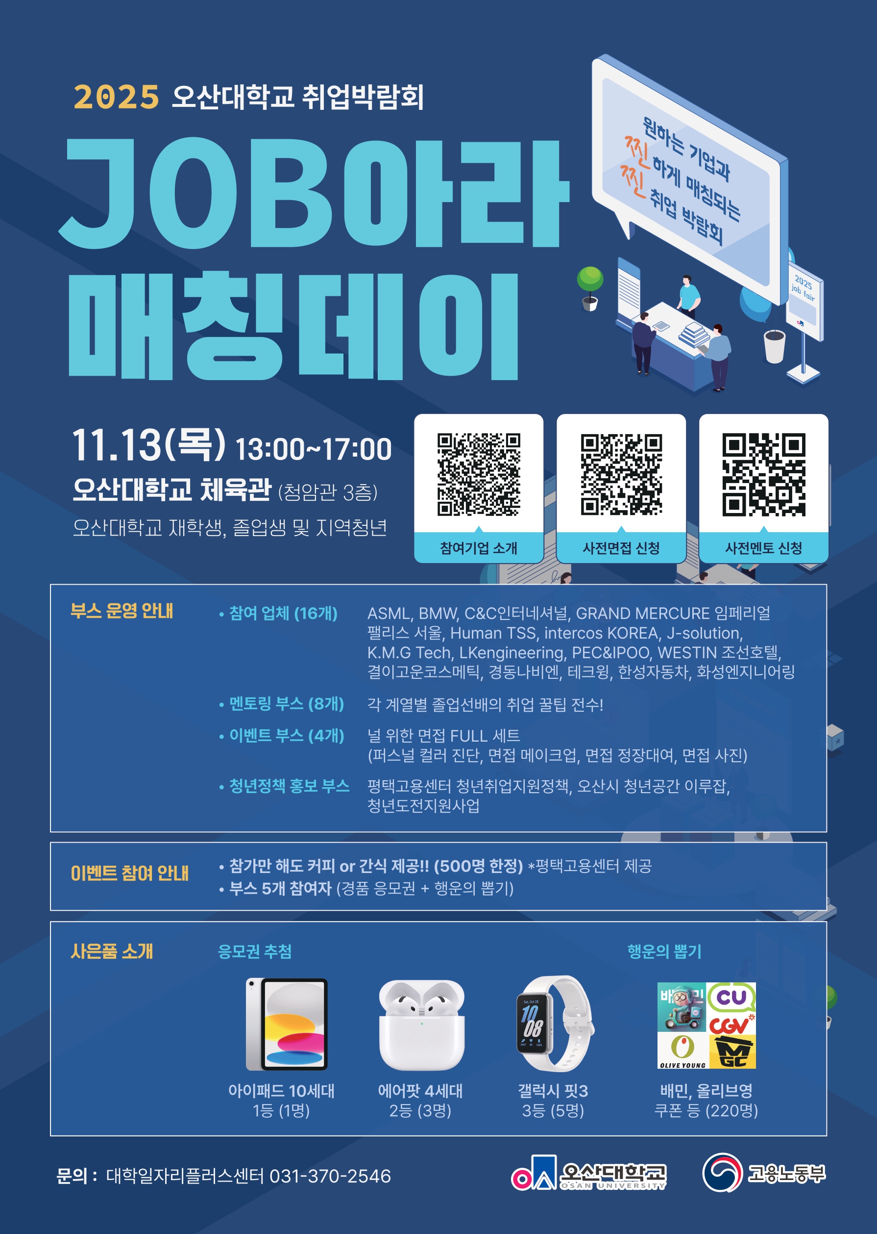 [교외] 오산대학교 2025 잡(JOB)아라 매칭데이, 취업박람회 개최 안내
