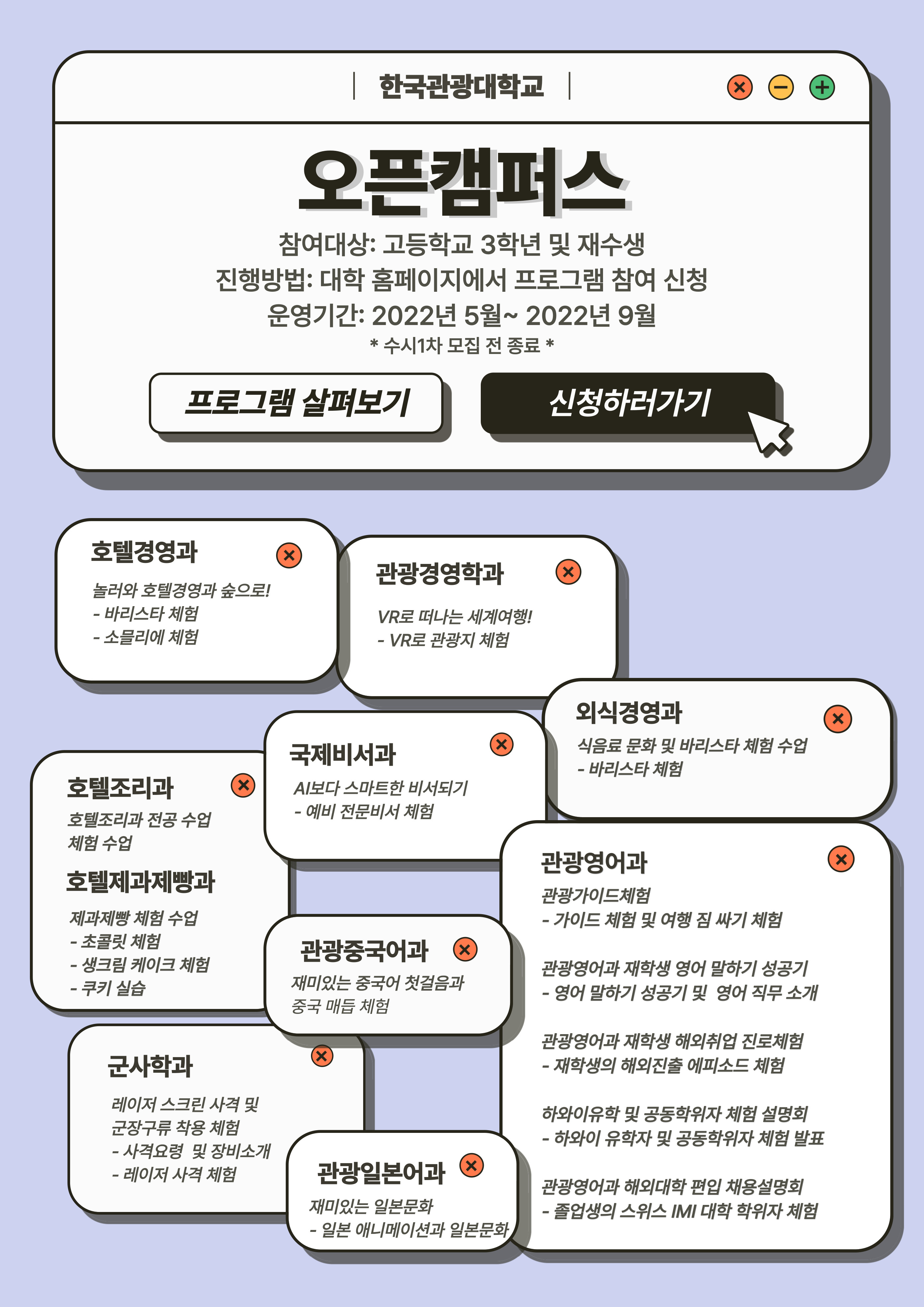 기다리시고 기다리시던 2022년 한국관광대학교 「오픈캠퍼스」를 시행합니다!!!