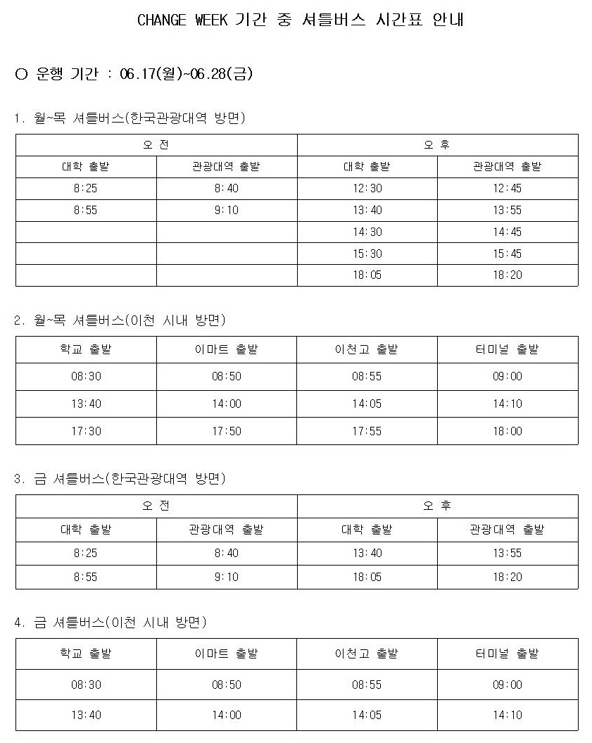 CHANGE WEEK 기간 중 셔틀 버스 시간표 안내