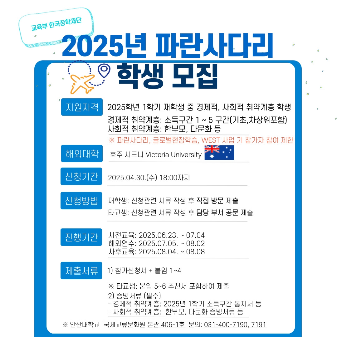 교육부와 한국장학재단이 주관하는 '2025년 파란사다리 1유형 사업' 참여자를 다음과 같이 모집합니다.