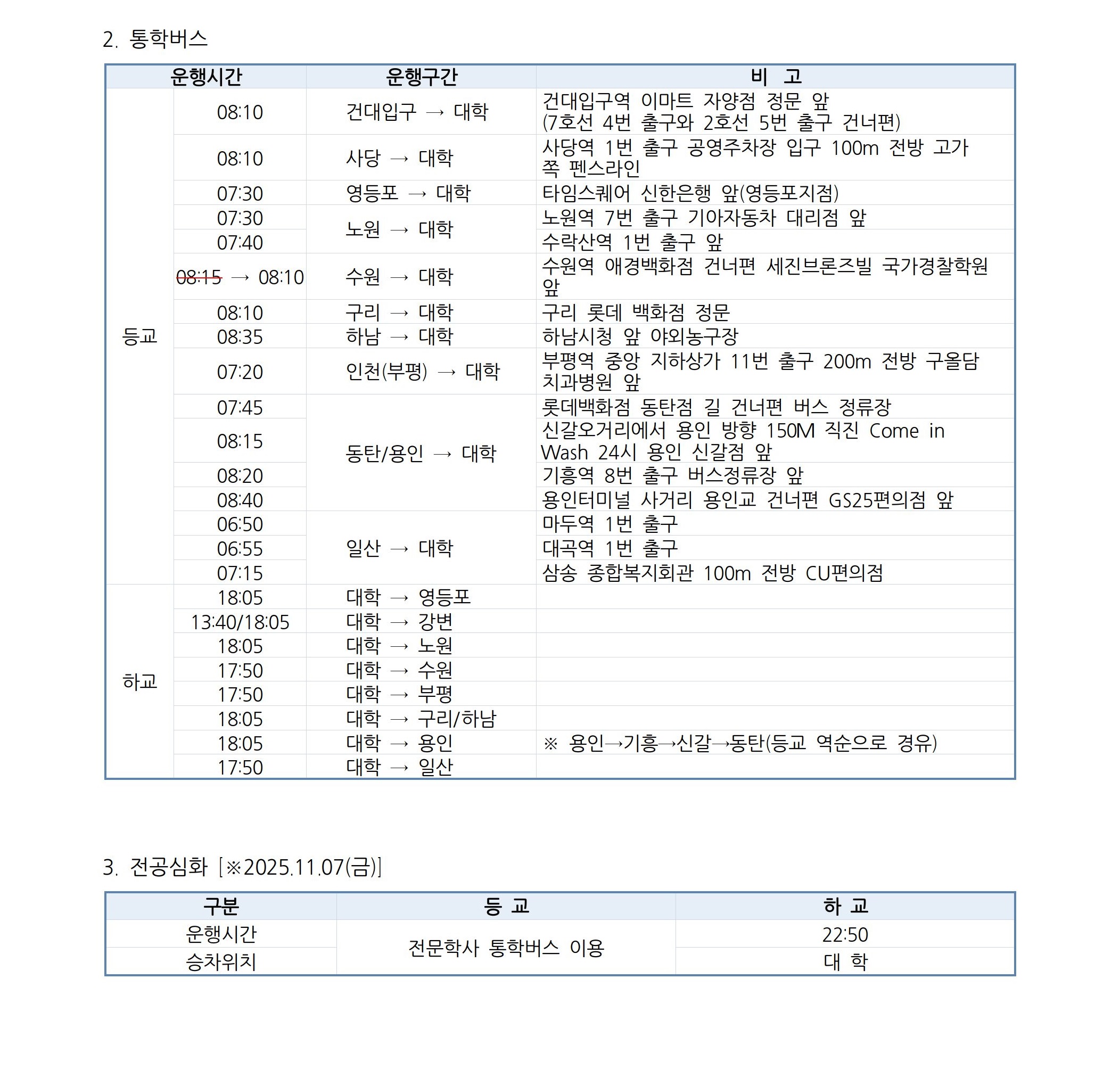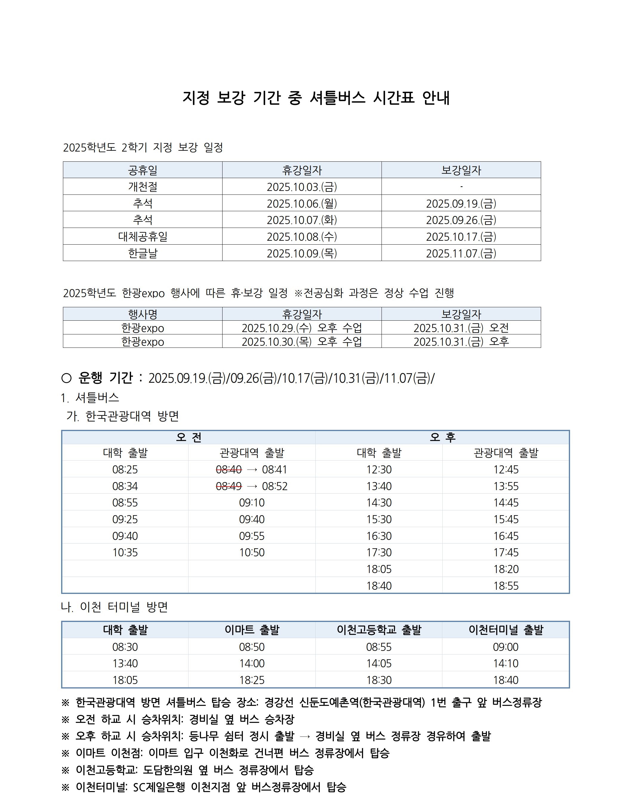 2025학년도 2학기 지정 보강 기간 중 셔틀버스 시간표 안내(2025.10.17.기준)