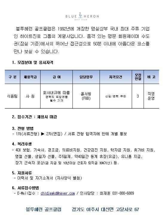 [추천채용] 블루헤런 골프클럽 식음팀 사원 채용