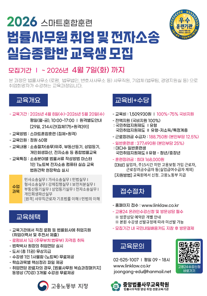 여러분의 취창업에 도움이 될 수 있는 2026 법률사무직원 취업교육과정 모집 안내 드립니다.