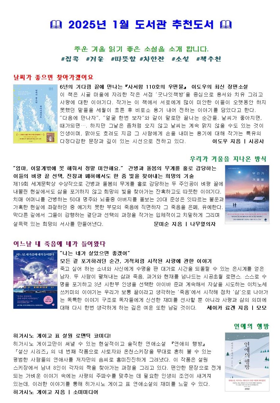 도서관에서는 이달의 추천도서(2025년 1월)로 추운 겨울 읽기 좋은 소설을 소개합니다.