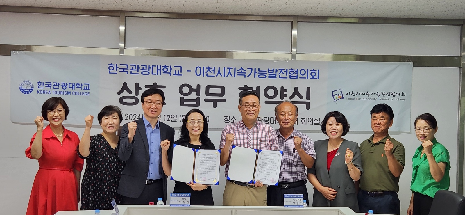 한국관광대학교(최형인 총장)와 이천시지속가능발전협의회(대표 정철화)은 2024년 8월 12일 한국관광대학교 대회의실에서 상호업무 협약을 체결하였다.
