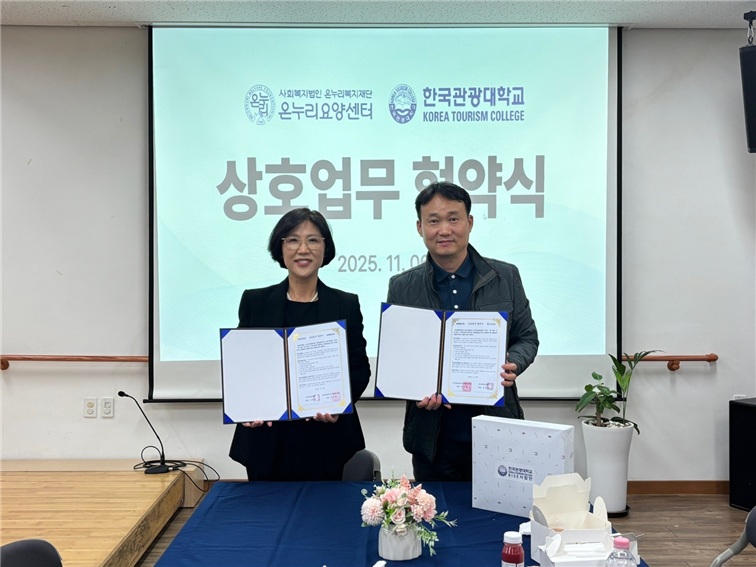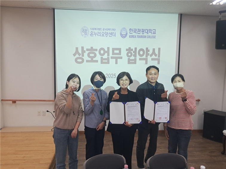 한국관광대학교(김성용 총장) RISE사업단과 사회복지법인 온누리복지재단 온누리요양센터(김정진 원장)은 2025년 11월 6일 상호업무 협약식을 체결하였다.