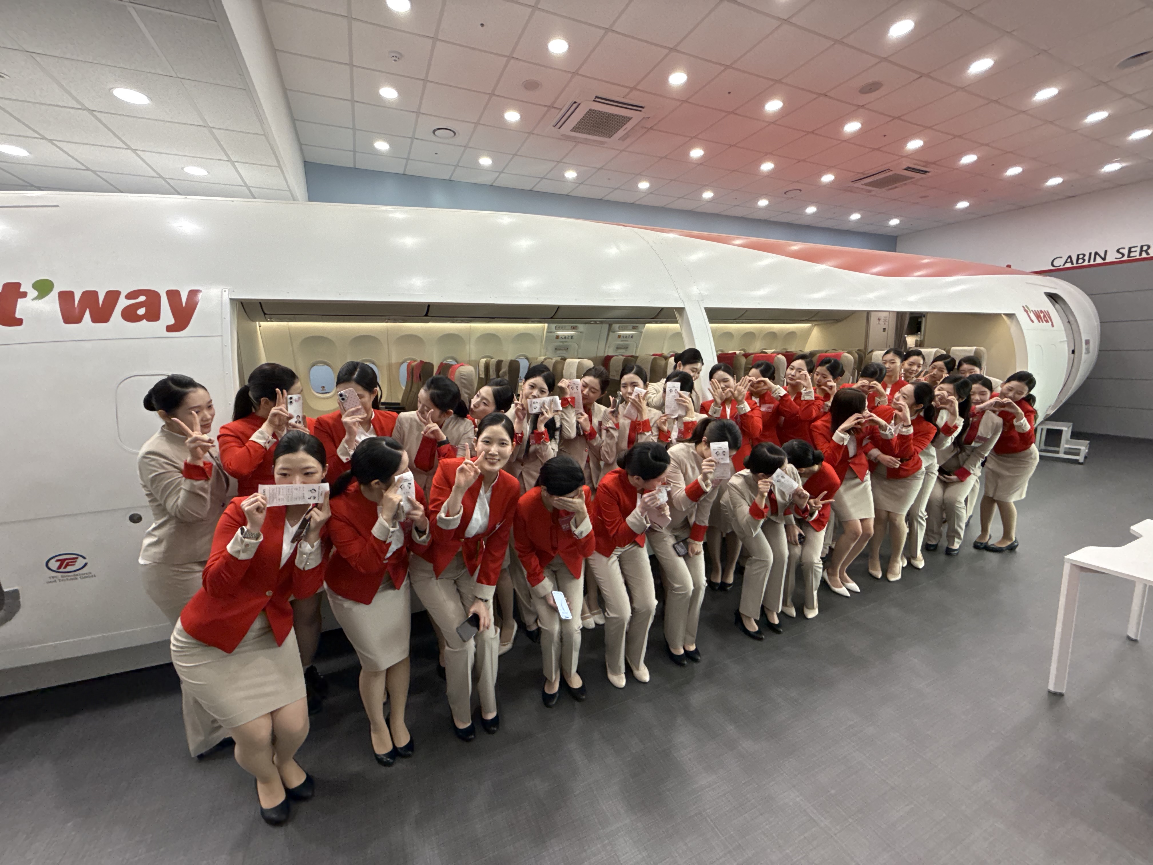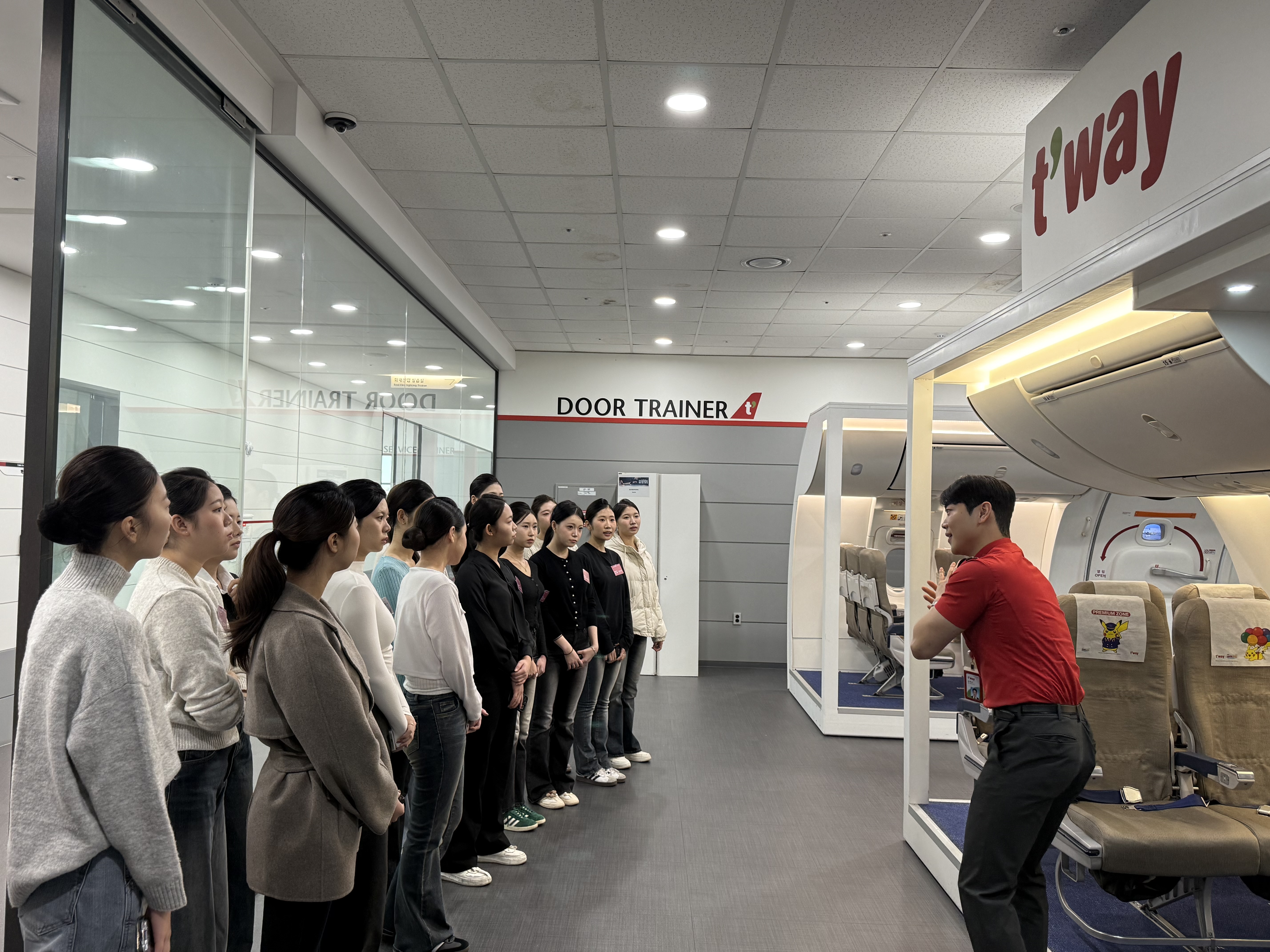 한국관광대학교 항공서비스과는 지난 11월 14일,21일 양일간 가족회사인 티웨이항공 훈련센터에서 ‘티웨이항공 크루 클래스(Crew Class)’ 체험 프로그램에 1학년 82명이 참여할 수 있도록 전액 교비를 지원해 운영했다. 이번 프로그램은 객실승무원 직무에 대한 이해도를 높이고, 항공사 업무 전반에 대한 전문 지식을 쌓을 수 있도록 설계된 실습 중심 교육이다.