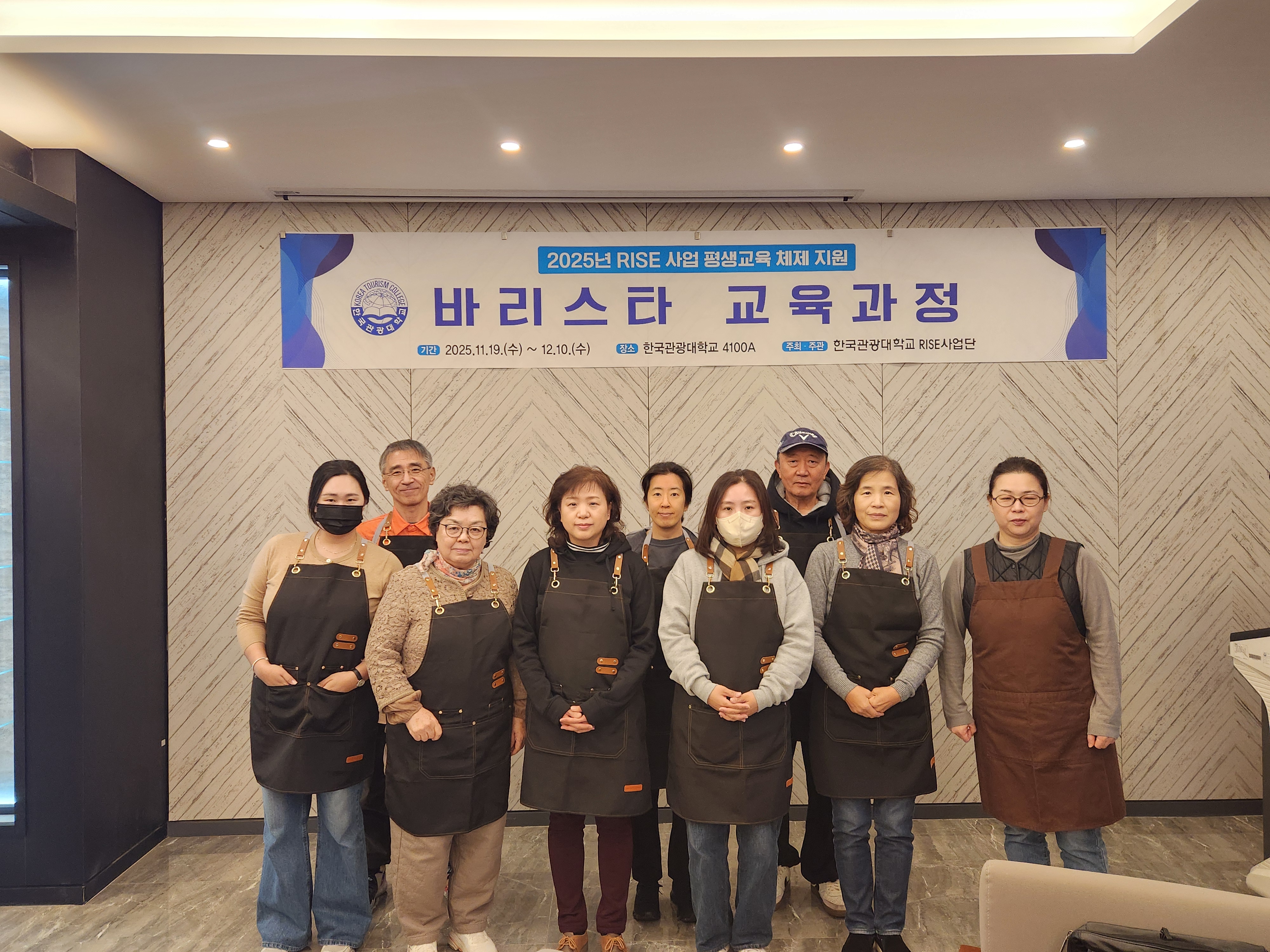 한국관광대학교(총장 김성용) RISE사업단은 평생학습지원체제의 일환으로 지난 11월 19일부터 12월 10일까지 4회에 걸쳐 바리스타 교육과정을 운영하였다.