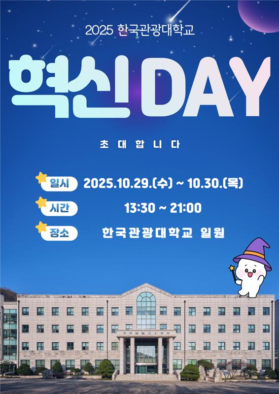 한국관광대학교(총장 김성용)는 지난 10월 29일 부터 10월 30일 까지 2일간 혁신 DAY를 개최 했다고 밝혔다. 이번 행사는 혁신지원사업 성과공유 등을 통하여 우리대학의 나아갈 방향을 설정함을 목적으로 개최되었다.