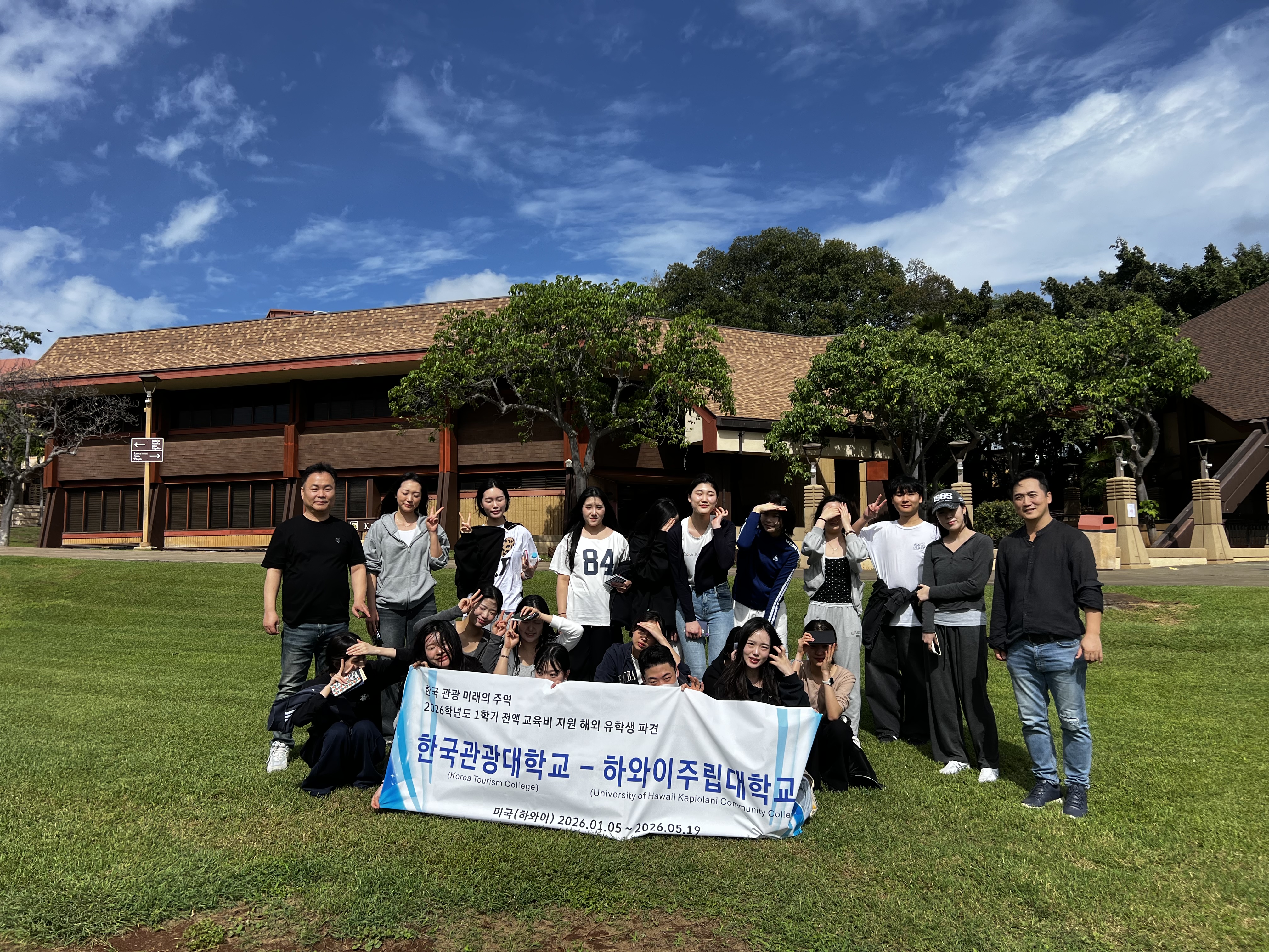 2026년 1월 5일(월) 한국관광대학교(총장 김성용) 재학생 20명은 한 학기 18주 과정 미국 유학생으로 선발돼 출국했다고 밝혔다. 대학의 대표적인 ‘전액지원 미국 하와이 해외유학 프로그램’은 하와이주립대 KCC(Kapiolani Community College) 캠퍼스에서 한 학기(18주) 동안 진행되며, 학생들은 다양한 학습과 체험을 통해 관광 및 호스피탈리티 산업에 대한 전문 지식을 쌓게 된다.
